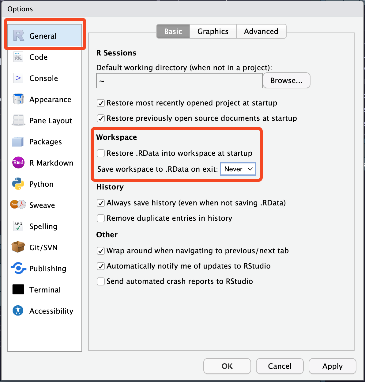 The final thing to do, that’s actually quite important, is to turn off the “Restore .RData into workspace at startup”. The reason being, if you do not, objects from previous sessions will be loaded into your new working environment, putting things where they shouldn’t be, making it very difficult to catch bugs as your code may reference something that doesn’t exist by that point in your script as it is created later on, but you wouldn’t catch that mistake as it was loaded into your environment on startup.
